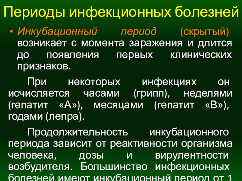 Продолжительность инкубационного периода зависит от реактивности организма человека, дозы и вирулентности возбудителя. Большинство инфекционных болезней имеют инкубационный период от 1 до 3 недель.