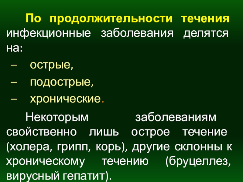 острое течение (холера, грипп, корь), другие склонны к хроническому течению (бруцеллез, вирусный гепатит).