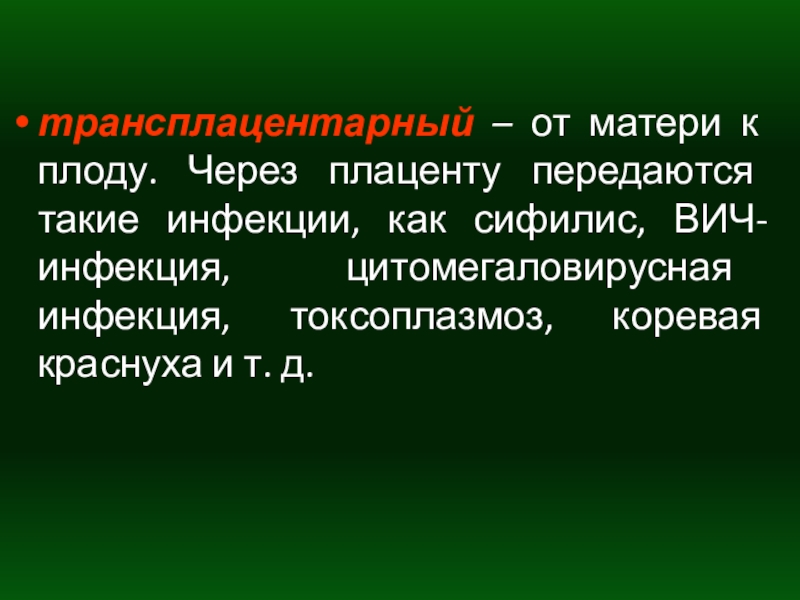 Слайд 21трансплацентарный – от матери к плоду. Через плаценту передаются такие инфекции,