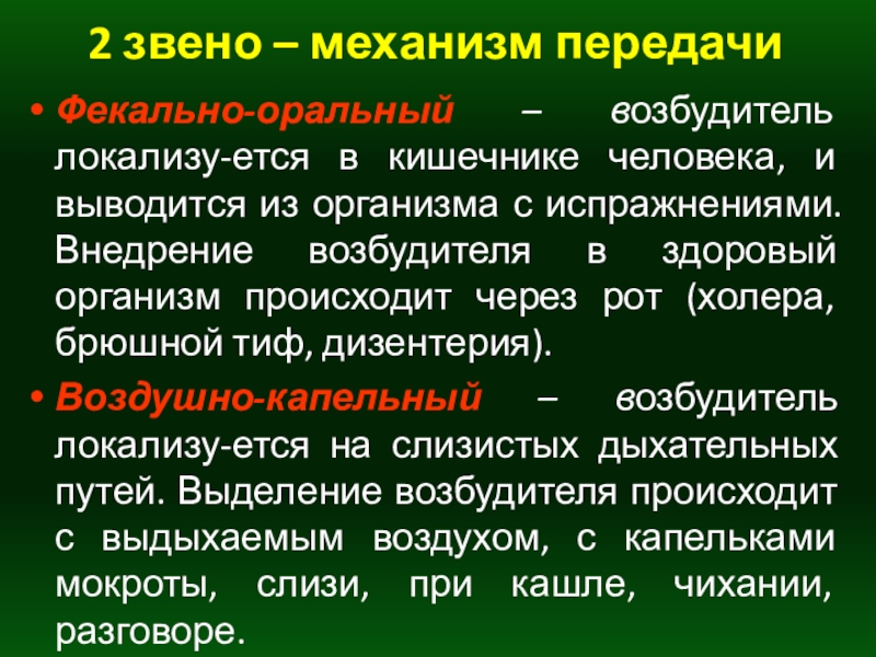 и выводится из организма с испражнениями. Внедрение возбудителя в здоровый организм происходит через рот (холера, брюшной тиф, дизентерия).