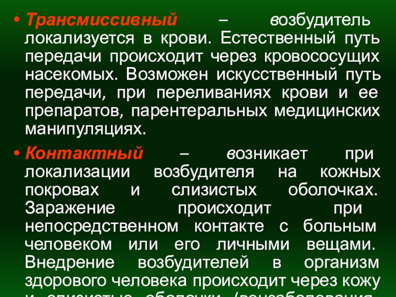 Слайд 20Трансмиссивный – возбудитель локализуется в крови. Естественный путь передачи происходит через