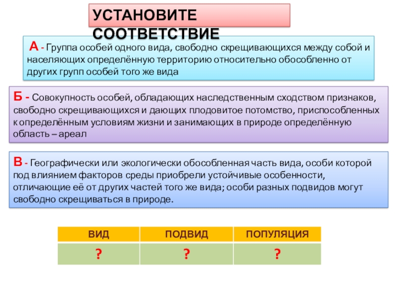 А - Группа особей одного вида, свободно скрещивающихся между собой и населяющих определённую территорию относительно обособленно от других групп особей того же вида