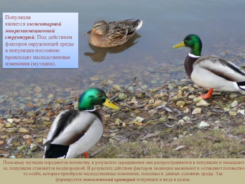 Популяция является элементарной микроэволюционной структурой. Под действием факторов окружающей среды в популяции постоянно происходят наследственные изменения (мутации).