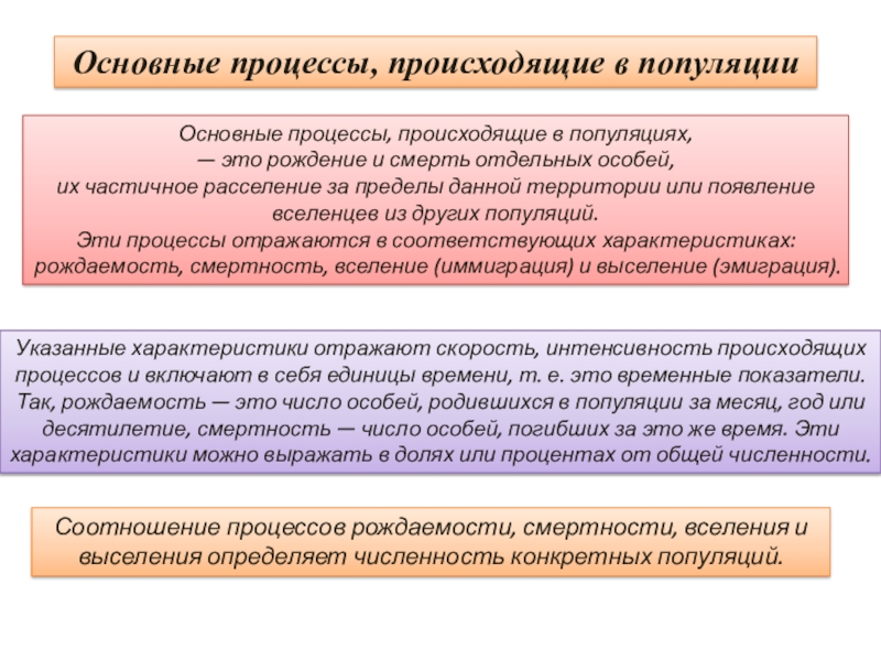 Эти процессы отражаются в соответствующих характеристиках: рождаемость, смертность, вселение (иммиграция) и выселение (эмиграция).