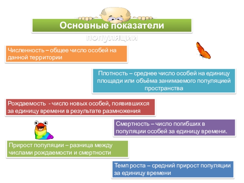 Указанные характеристики отражают скорость, интенсивность происходящих процессов и включают в себя единицы времени, т. е. это временные показатели. Так, рождаемость — это число особей, родившихся в популяции за месяц, год или десятилетие, смертность — число особей, погибших за это же время. Эти характеристики можно выражать в долях или процентах от общей численности.