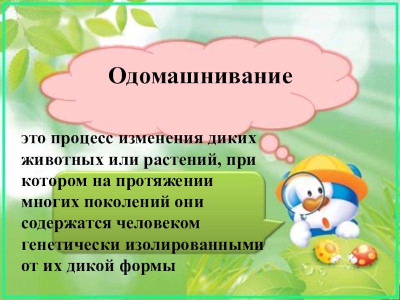 Одомашниваниеэто процесс изменения диких животных или растений, при котором на протяжении многих поколений они содержатся человеком генетически изолированными от их дикой формы