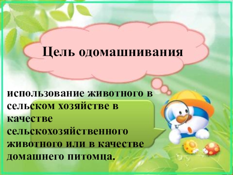Цель одомашнивания использование животного в сельском хозяйстве в качестве сельскохозяйственного животного или в качестве домашнего питомца.