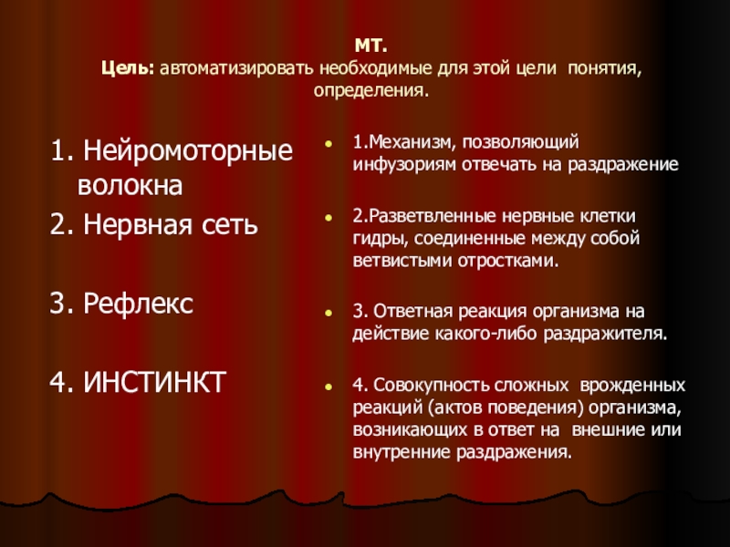 сущность понятий: нервные узлы: нейромоторные волокна, нервная сеть, раздражимость, рефлекс, нервная система, инстинкт, общественные насекомые,