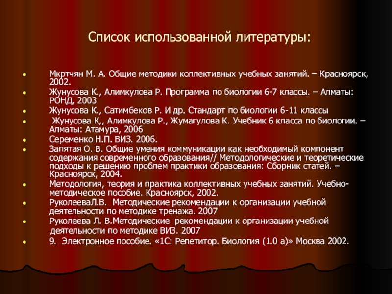 Жунусова К., Алимкулова Р. Программа по биологии 6-7 классы. – Алматы: РОНД, 2003