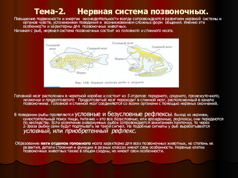 Начиная с рыб, нервная система позвоночных состоит из головного и спинного мозга.
