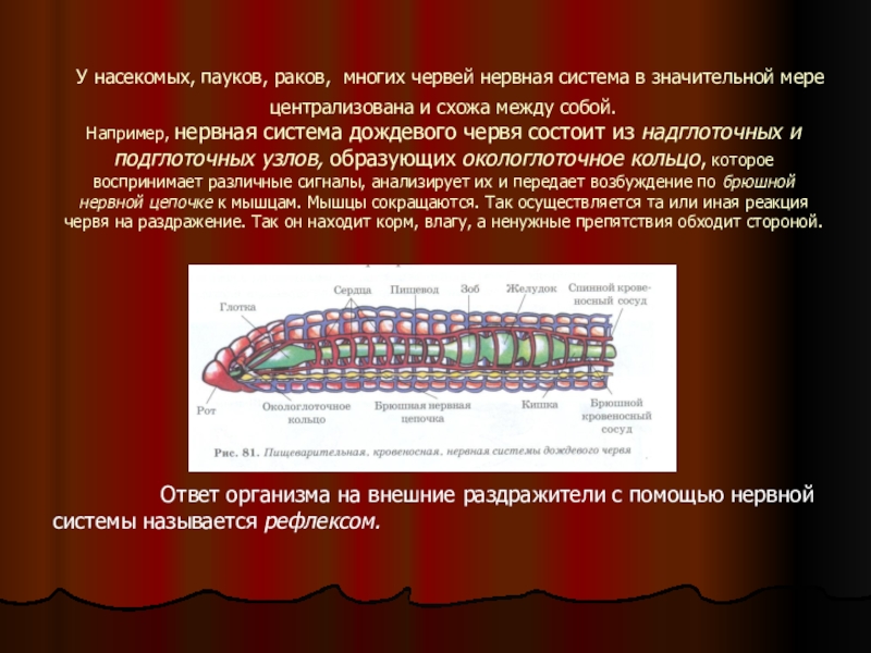Слайд 9 У насекомых, пауков, раков, многих червей нервная система в значительной