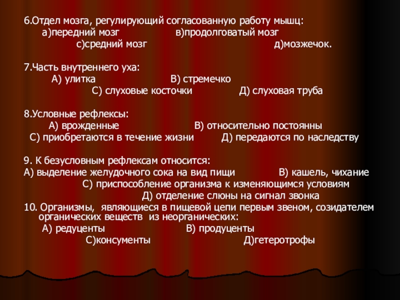 Слайд 256.Отдел мозга, регулирующий согласованную работу мышц: