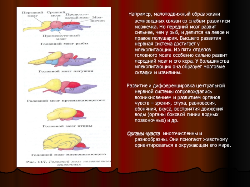 Например, малоподвижный образ жизни земноводных связан со слабым развитием мозжечка.