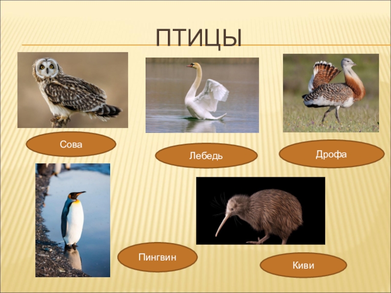 ПТИЦЫ Сова Лебедь Киви Дрофа Пингвин