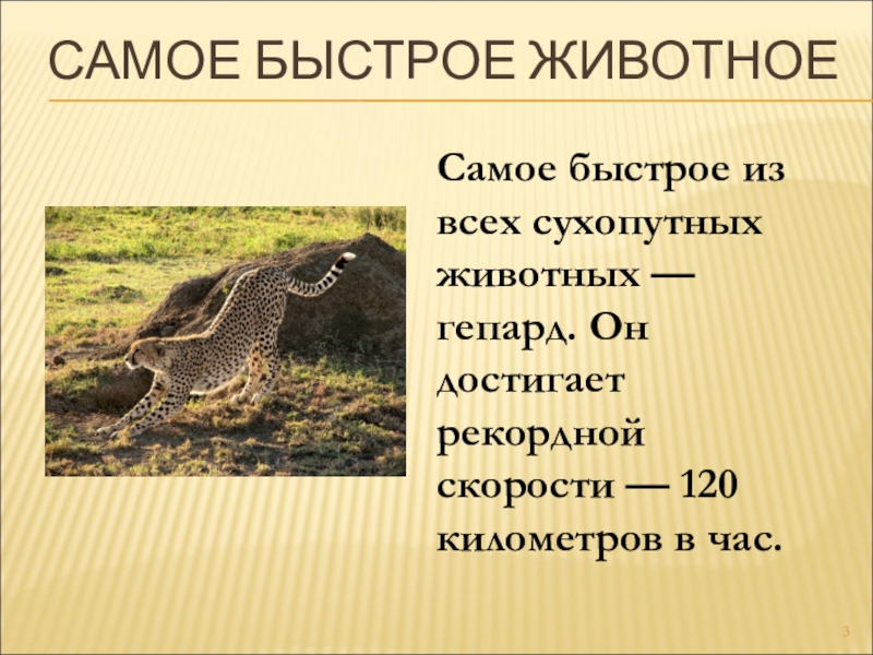 САМОЕ БЫСТРОЕ ЖИВОТНОЕ Самое быстрое из всех сухопутных животных — гепард. Он достигает рекордной скорости — 120