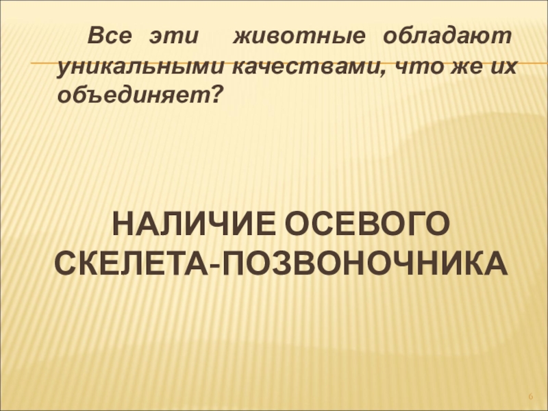 НАЛИЧИЕ ОСЕВОГО СКЕЛЕТА-ПОЗВОНОЧНИКА  Все эти животные обладают  уникальными качествами, что же их объединяет?