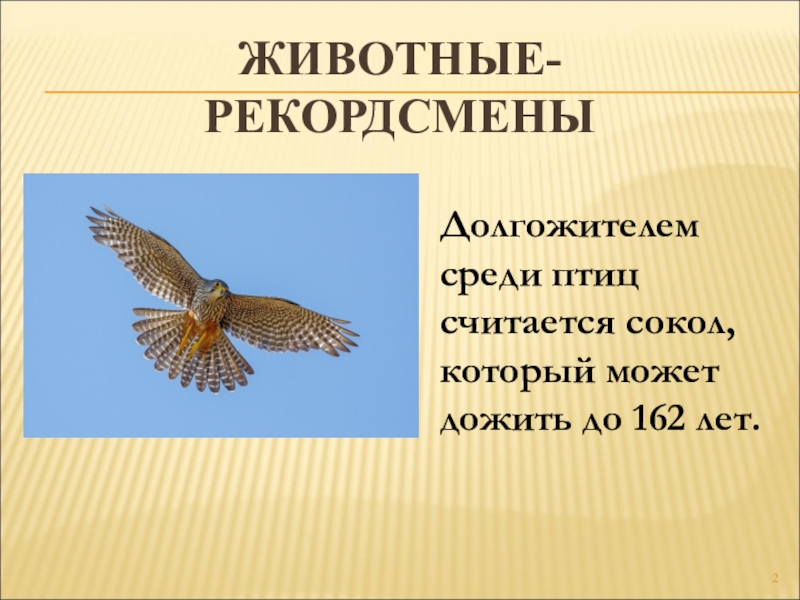 ЖИВОТНЫЕ-РЕКОРДСМЕНЫ Долгожителем среди птиц считается сокол, который может дожить до 162 лет.