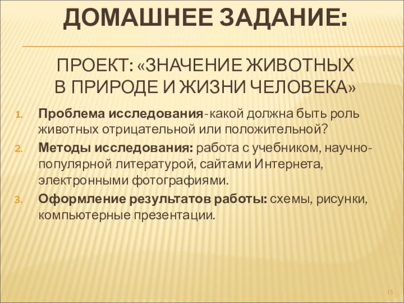Слайд 15 ДОМАШНЕЕ ЗАДАНИЕ: ПРОЕКТ: «ЗНАЧЕНИЕ ЖИВОТНЫХ В ПРИРОДЕ И ЖИЗНИ ЧЕЛОВЕКА»