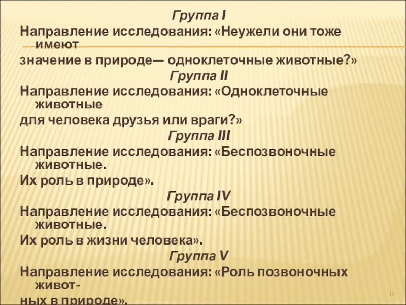 Группа IНаправление исследования: «Неужели они тоже имеютзначение в природе— одноклеточные животные?»Группа IIНаправление исследования: «Одноклеточные животныедля человека друзья