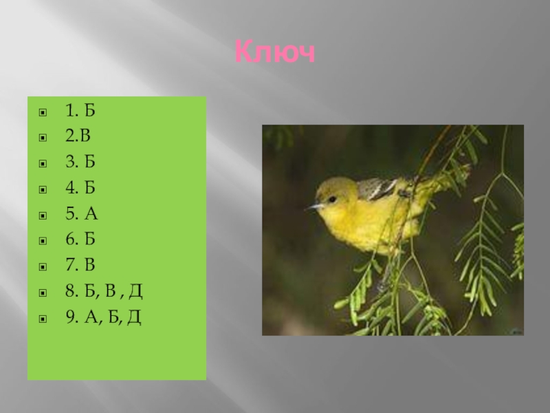 Ключ 1. Б2.В3. Б4. Б5. А6. Б7. В8. Б, В , Д9. А, Б, Д
