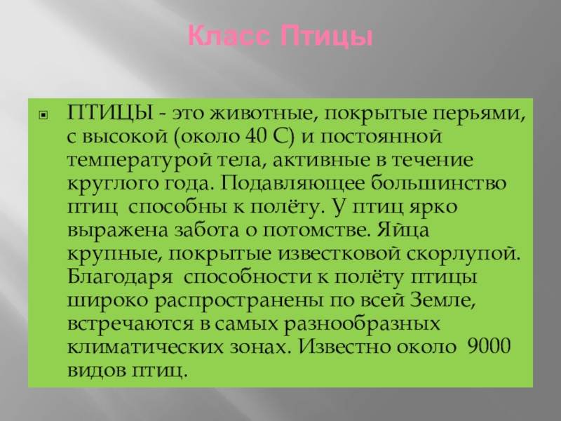 40 С) и постоянной температурой тела, активные в течение круглого года. Подавляющее большинство птиц способны к полёту. У птиц ярко выражена забота о потомстве. Яйца крупные, покрытые известковой скорлупой. Благодаря способности к полёту птицы широко распространены по всей Земле, встречаются в самых разнообразных климатических зонах. Известно около 9000 видов птиц.