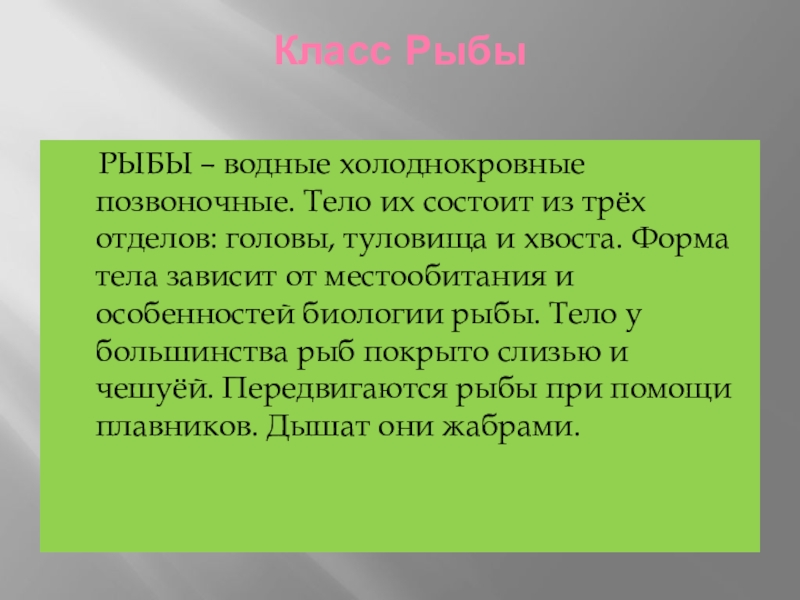Класс Рыбы     РЫБЫ – водные холоднокровные позвоночные. Тело их состоит из трёх отделов: