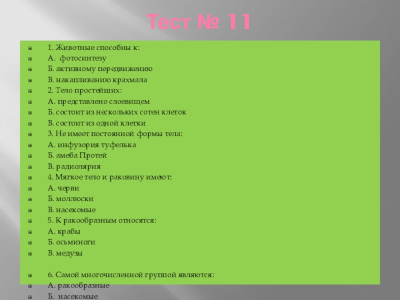 Тест № 111. Животные способны к:А. фотосинтезуБ. активному передвижениюВ. накапливанию крахмала2. Тело простейших:А. представлено слоевищемБ. состоит из нескольких сотен клетокВ. состоит из одной клетки3. Не имеет постоянной формы тела:А. инфузория туфелькаБ. амеба ПротейВ. радиолярия4. Мягкое тело