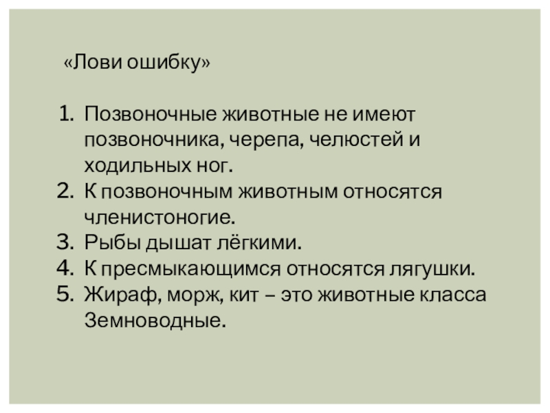 «Лови ошибку»Позвоночные животные не имеют позвоночника, черепа, челюстей и ходильных ног.К позвоночным животным относятся членистоногие.Рыбы дышат лёгкими.К