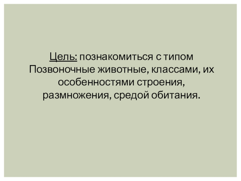 Слайд 10Цель: познакомиться с типом Позвоночные животные, классами, их особенностями строения, размножения,