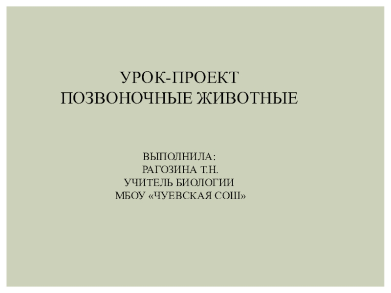 УРОК-Проект ПОЗВОНОЧНЫЕ ЖИВОТНЫЕ   Выполнила:  Рагозина Т.Н.  учитель биологии  МБОУ «Чуевская СОШ»