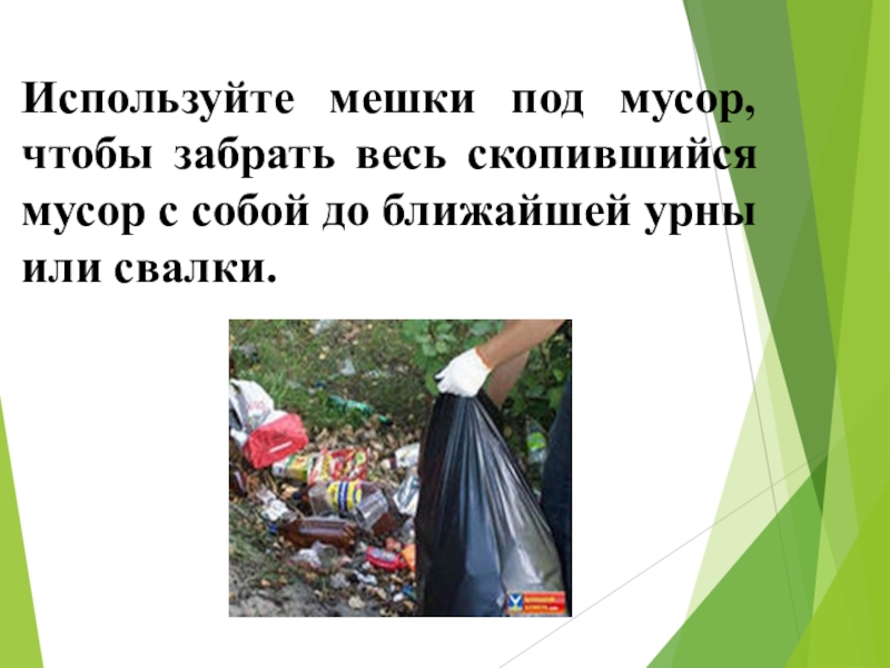 Слайд 19Используйте мешки под мусор, чтобы забрать весь скопившийся мусор с собой