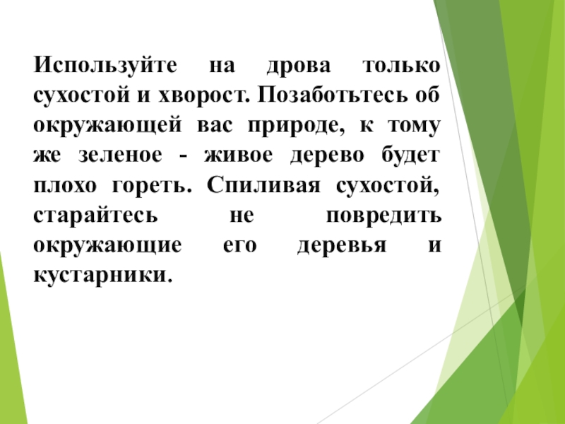 Слайд 17Используйте на дрова только сухостой и хворост. Позаботьтесь об окружающей вас