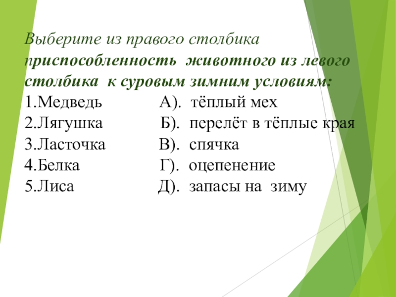 Слайд 3Выберите из правого столбика приспособленность животного из левого столбика к суровым