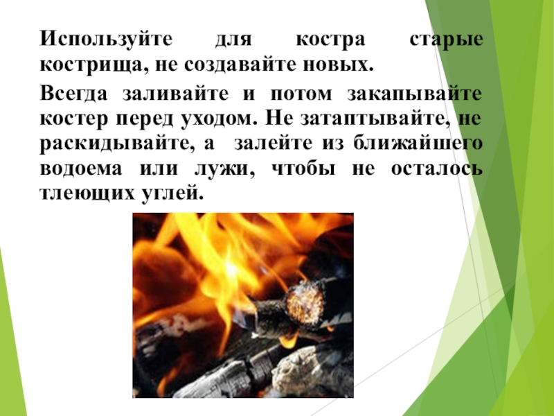 Слайд 18Используйте для костра старые кострища, не создавайте новых.