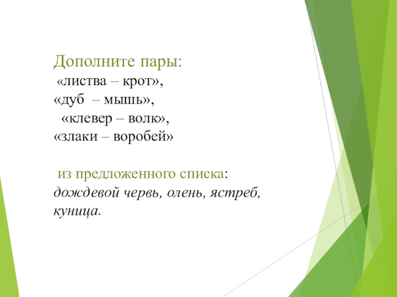 из предложенного списка: дождевой червь, олень, ястреб, куница.