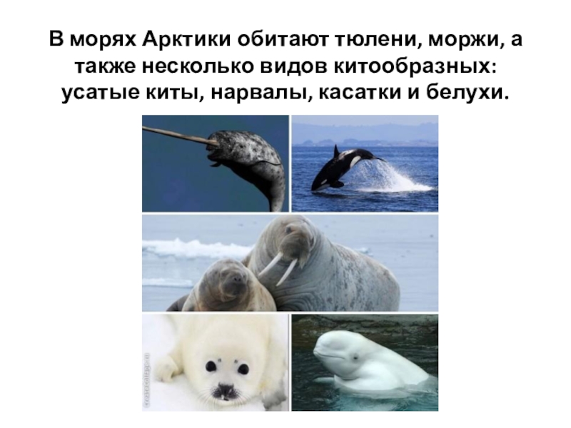 В морях Арктики обитают тюлени, моржи, а также несколько видов китообразных:
