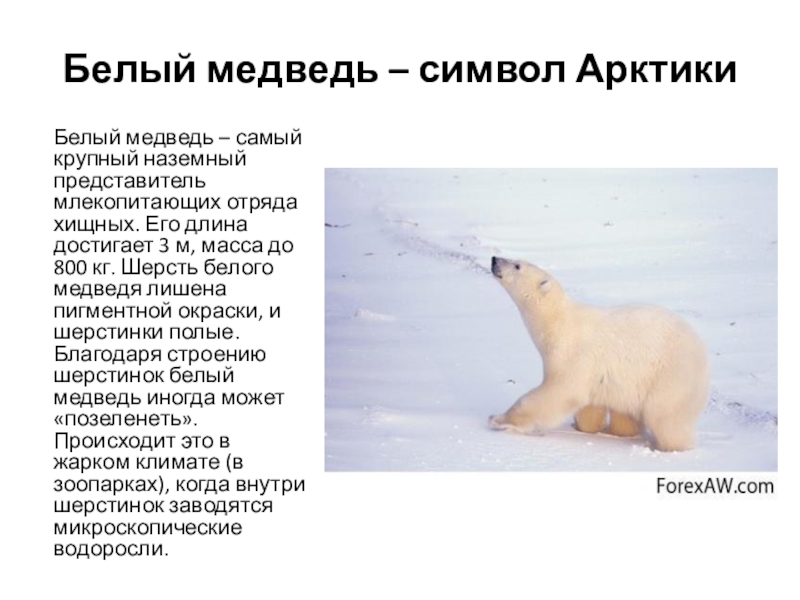 крупный наземный представитель млекопитающих отряда хищных. Его длина достигает 3 м, масса до 800 кг. Шерсть белого медведя лишена пигментной окраски, и шерстинки полые. Благодаря строению шерстинок белый медведь иногда может «позеленеть». Происходит это в жарком климате (в зоопарках), когда внутри шерстинок заводятся микроскопические водоросли.