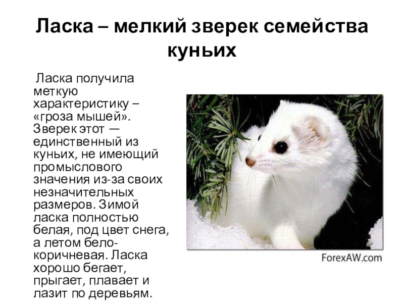 меткую характеристику – «гроза мышей». Зверек этот — единственный из куньих, не имеющий промыслового значения из-за своих незначительных размеров. Зимой ласка полностью белая, под цвет снега, а летом бело-коричневая. Ласка хорошо бегает, прыгает, плавает и лазит по деревьям.