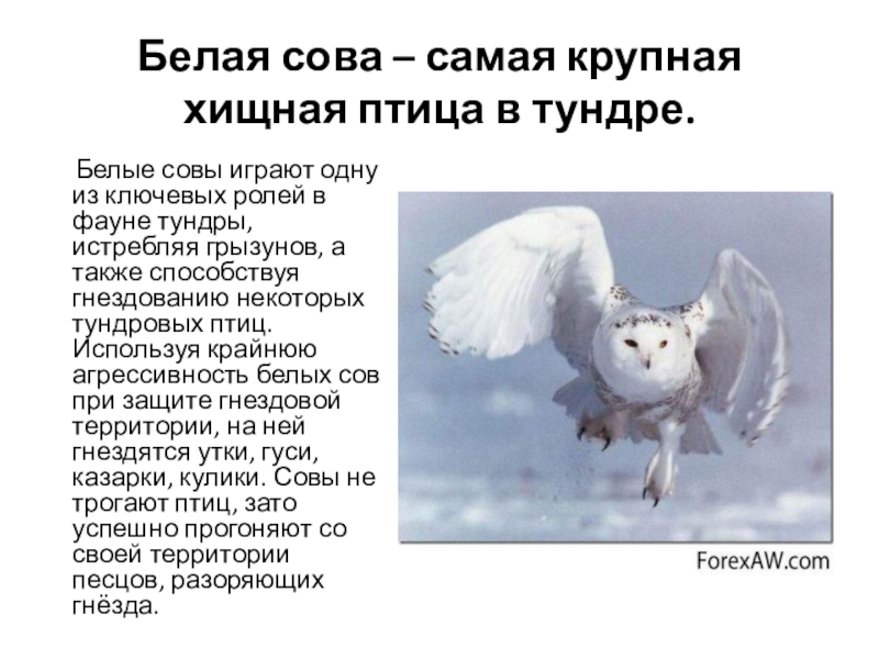 Слайд 5Белая сова – самая крупная хищная птица в тундре.
