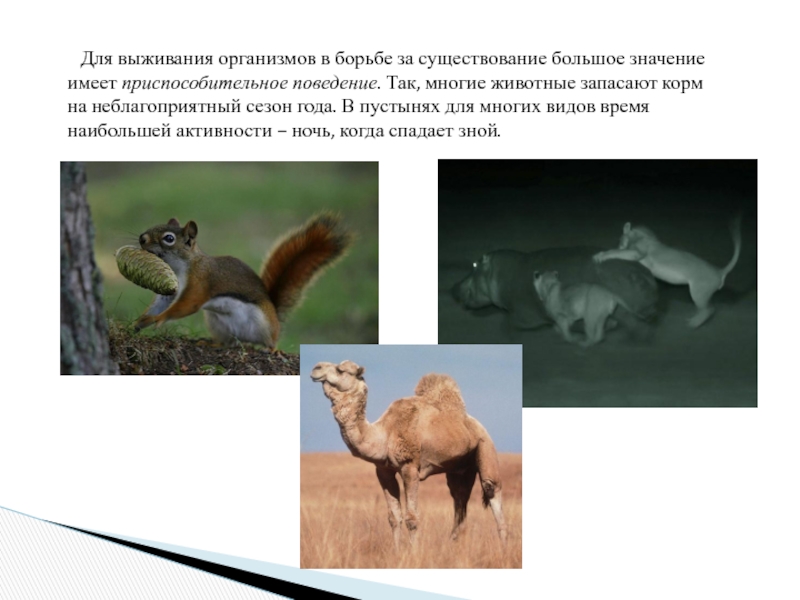 имеет приспособительное поведение. Так, многие животные запасают корм на неблагоприятный сезон года. В пустынях для многих видов время наибольшей активности – ночь, когда спадает зной.