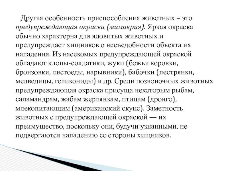 Слайд 5 Другая особенность приспособления животных – это предупреждающая окраска (мимикрия).