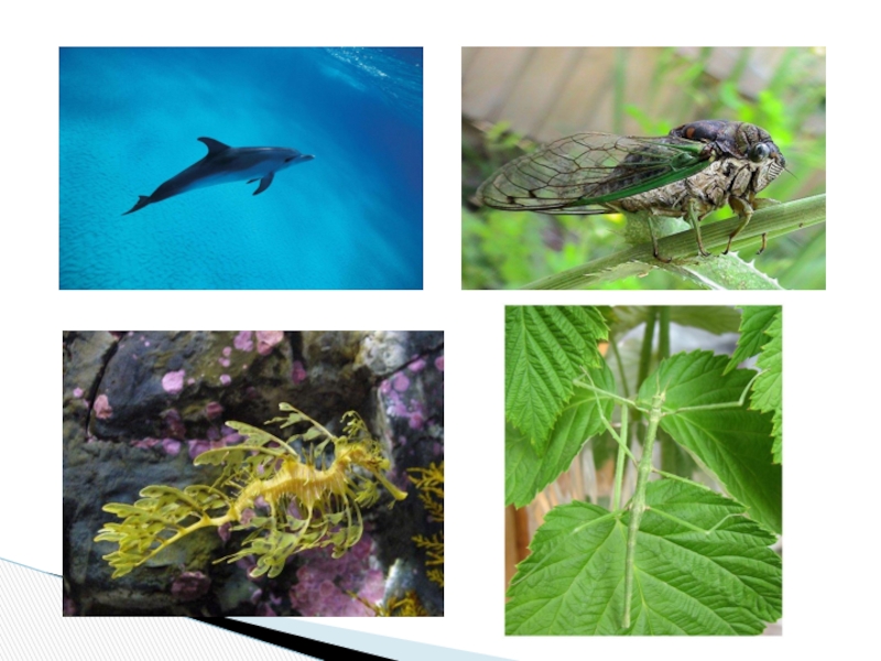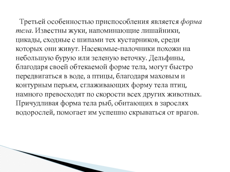 лишайники, цикады, сходные с шипами тех кустарников, среди которых они живут. Насекомые-палочники похожи на небольшую бурую или зеленую веточку. Дельфины, благодаря своей обтекаемой форме тела, могут быстро передвигаться в воде, а птицы, благодаря маховым и контурным перьям, сглаживающих форму тела птиц, намного превосходят по скорости всех других животных. Причудливая форма тела рыб, обитающих в зарослях водорослей, помогает им успешно скрываться от врагов.