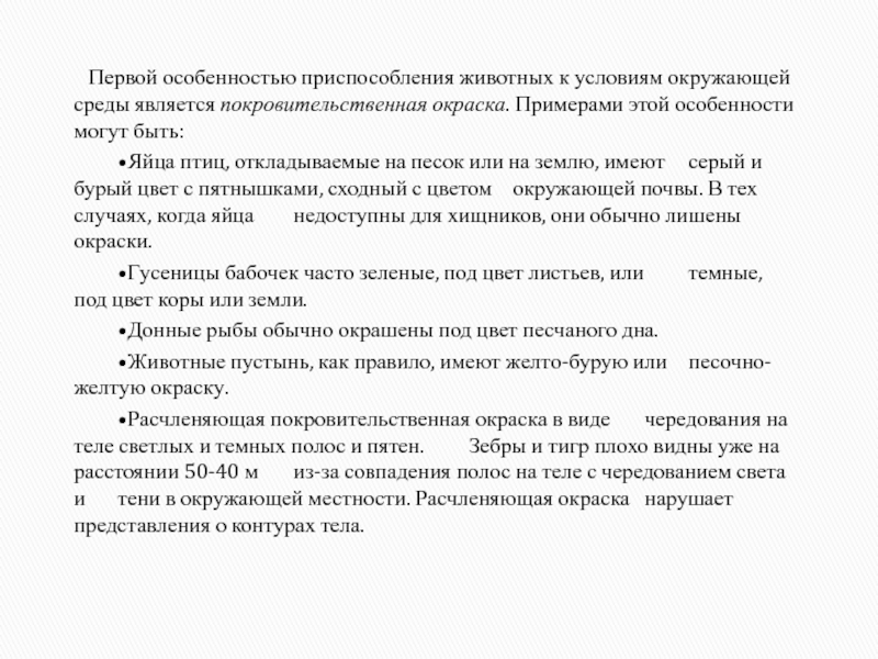 Первой особенностью приспособления животных к условиям окружающей среды является покровительственная окраска. Примерами этой особенности могут