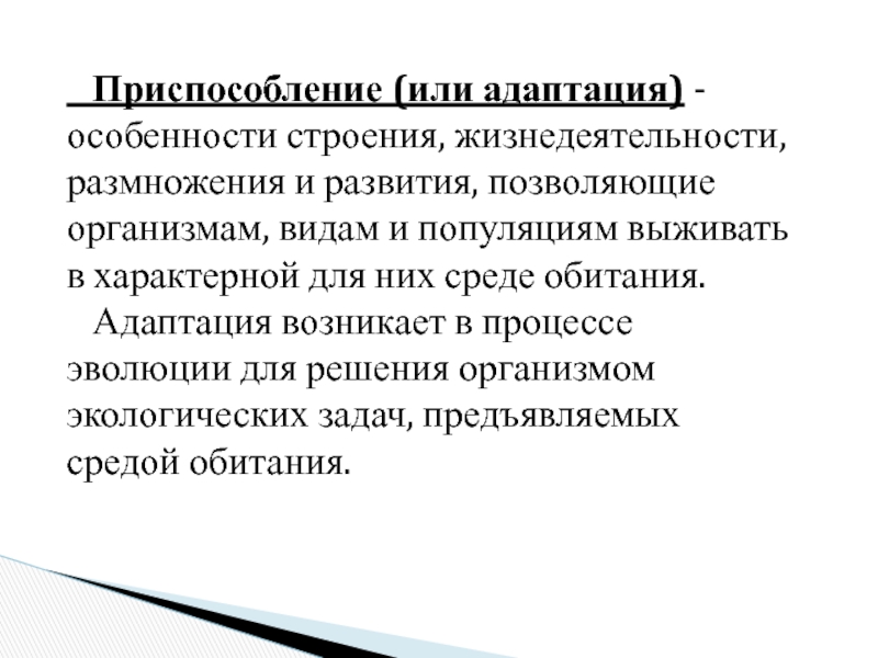 Приспособление (или адаптация) - особенности строения, жизнедеятельности, размножения и развития, позволяющие организмам, видам и популяциям выживать в характерной для них среде обитания. Адаптация возникает в процессе эволюции для решения организмом экологических задач, предъявляемых