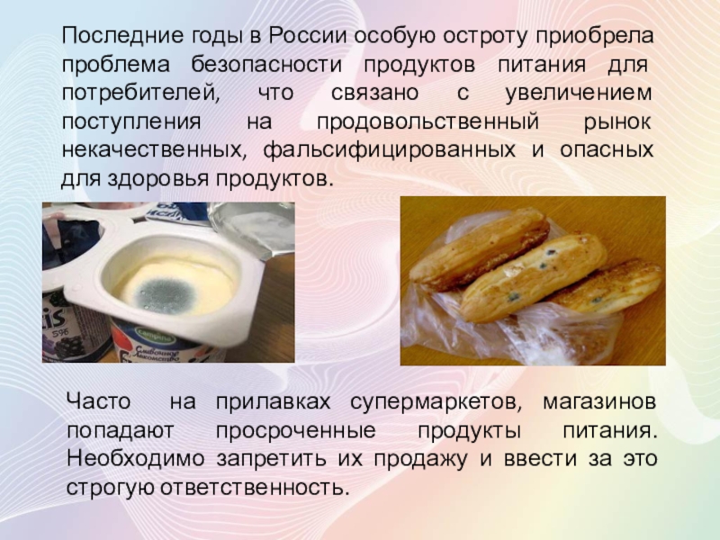 Часто на прилавках супермаркетов, магазинов попадают просроченные продукты питания. Необходимо запретить их продажу и ввести за это строгую ответственность.