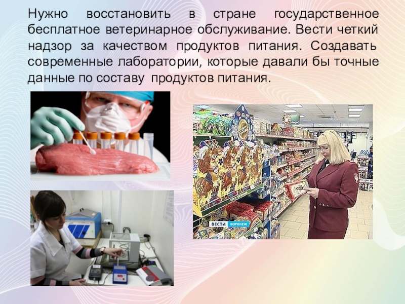 Слайд 12Нужно восстановить в стране государственное бесплатное ветеринарное обслуживание. Вести четкий надзор