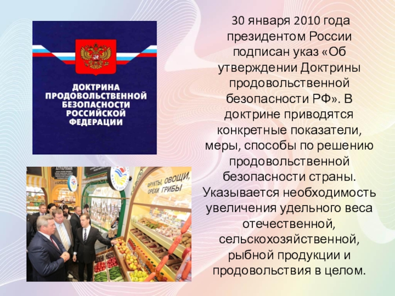 указ «Об утверждении Доктрины продовольственной безопасности РФ». В доктрине приводятся конкретные показатели, меры, способы по решению продовольственной безопасности страны. Указывается необходимость увеличения удельного веса отечественной, сельскохозяйственной, рыбной продукции и продовольствия в целом.