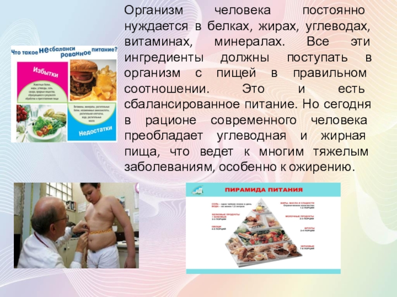 Слайд 9Организм человека постоянно нуждается в белках, жирах, углеводах, витаминах, минералах. Все