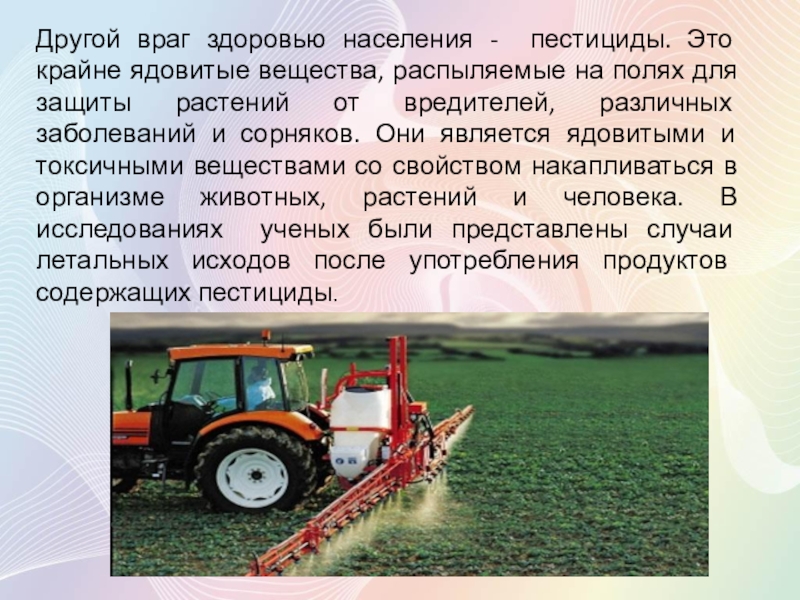 Слайд 7Другой враг здоровью населения - пестициды. Это крайне ядовитые вещества, распыляемые