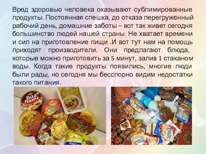 Слайд 5Вред здоровью человека оказывают сублимированные продукты. Постоянная спешка, до отказа перегруженный